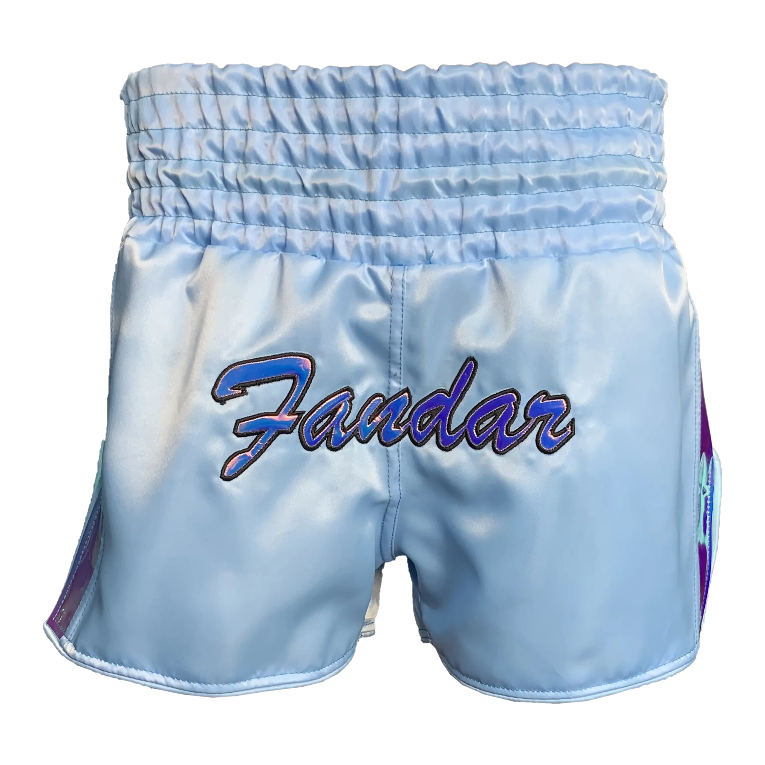 The clean sky blue colorway offers a fresh, professional look that stands out in the gym and the ring. Subtle Fandar branding makes these Muay Thai shorts instantly recognizable for quality, while remaining tasteful and team-friendly for custom embroidery or patches.