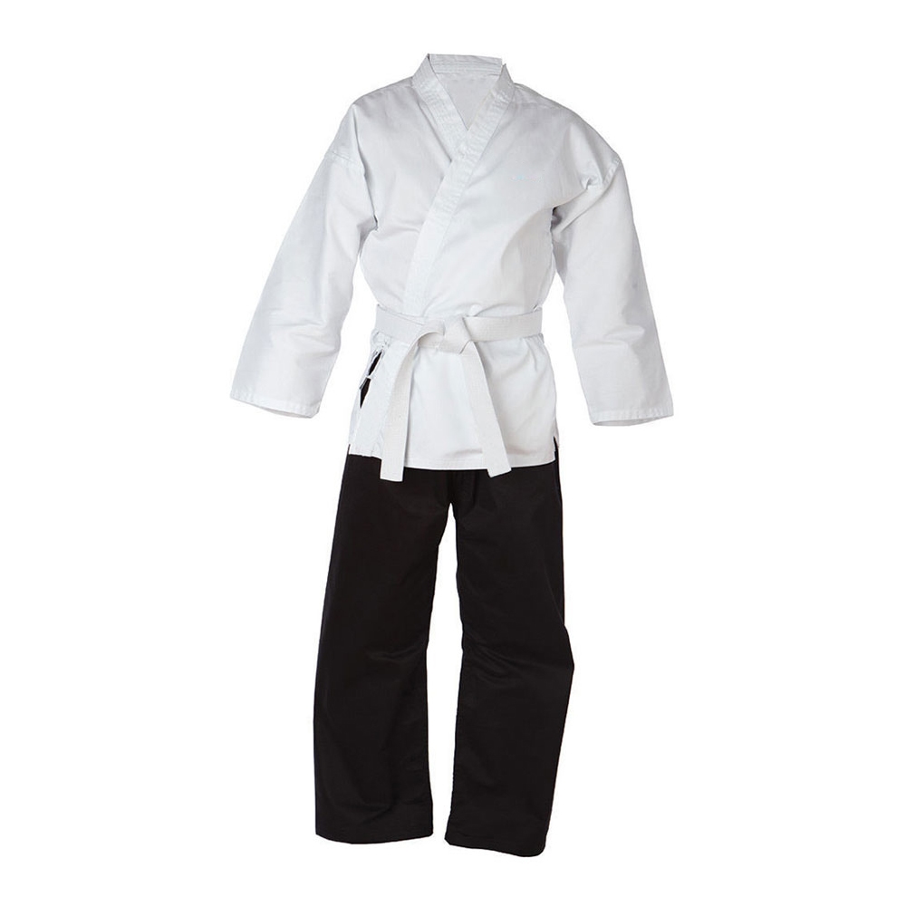 This traditional karate uniform is perfect for both beginners and experienced martial artists. Crafted from durable, breathable fabric, this gi allows for a full range of movement while remaining comfortable during intense training sessions. The crisp white jacket features a classic wrap-around design with reinforced stitching for long-lasting wear. The black pants provide a sleek contrast and are designed for flexibility and comfort with a traditional drawstring waist.